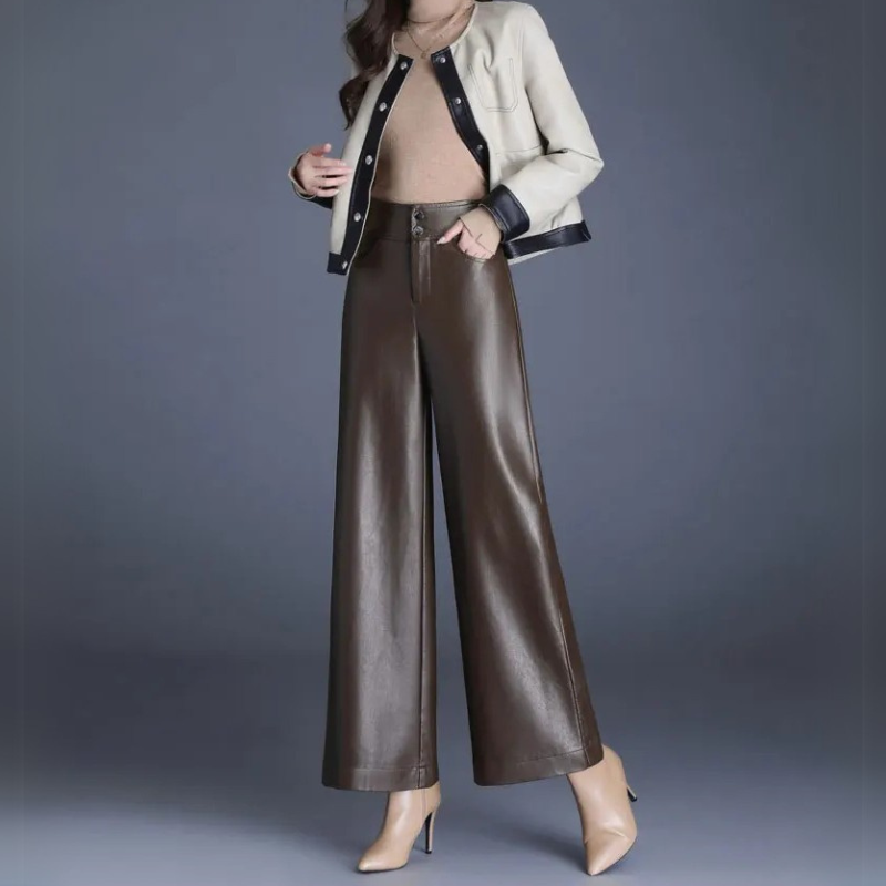 Crafted from smooth, high-gloss vegan leather, these high-rise wide-leg pants offer a chic look with subtle stretch for all-day comfort. Perfect for pairing with heels or casual layers.