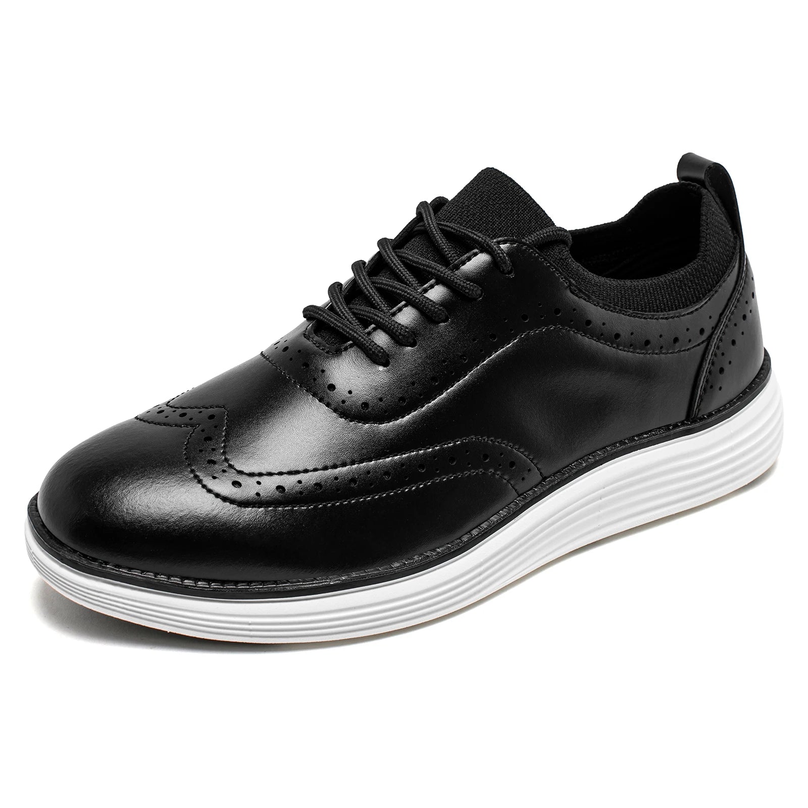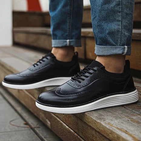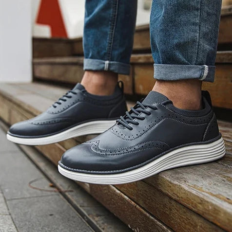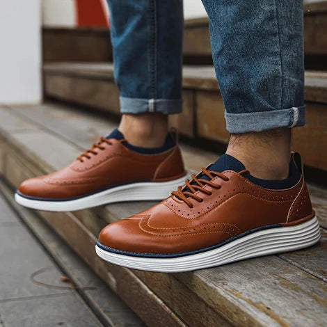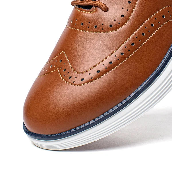 With brogue detailing for a polished look and a cushioned, shock-absorbing outsole, this leather dress sneaker offers formal style and casual comfort.