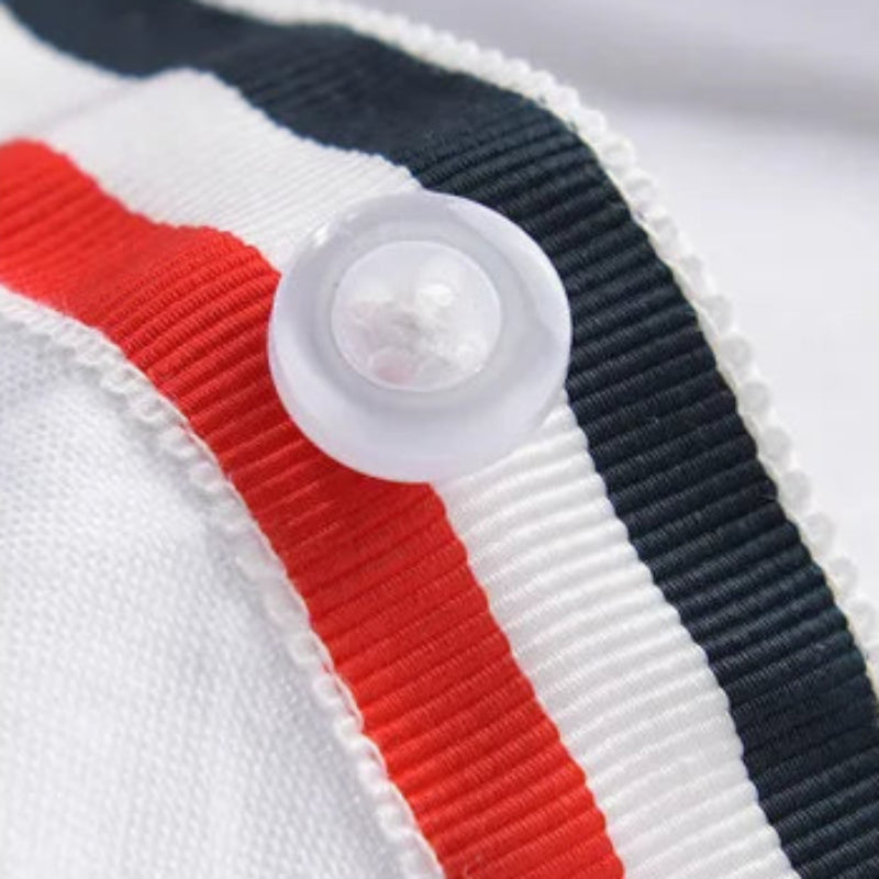 Made from 100% cotton, this summer-ready button-up is soft, breathable, and built for comfort. The red, white, and navy striped detailing along the placket and sleeve adds a crisp, sporty touch that stands out in every setting.