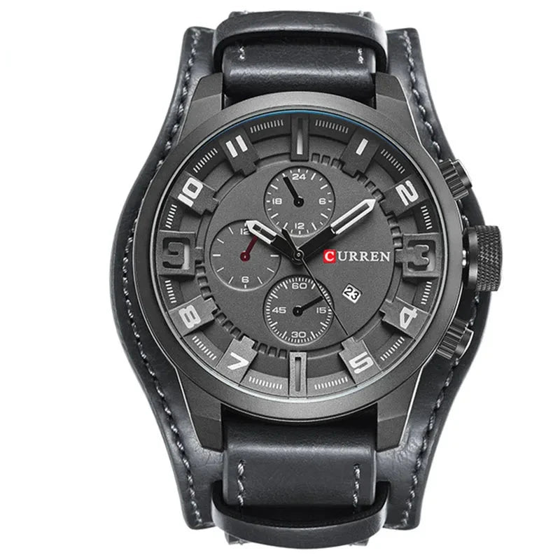 This watch masterfully combines timeless elegance with a bold, modern design. Equipped with three functional sub-dials for chronograph and calendar features, it offers exceptional practicality. The striking 3D markers enhance the dial’s depth, while the premium 100% cowhide leather strap ensures lasting comfort and durability throughout the day.